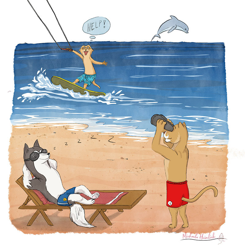 Erinnerungsbuch, Kapitel 13: Abenteuer am Meer.... Erdmännchen fährt zum ersten mal Kiten, leider haben Puma und Husky vergessen zu sagen, wie man wendet.
